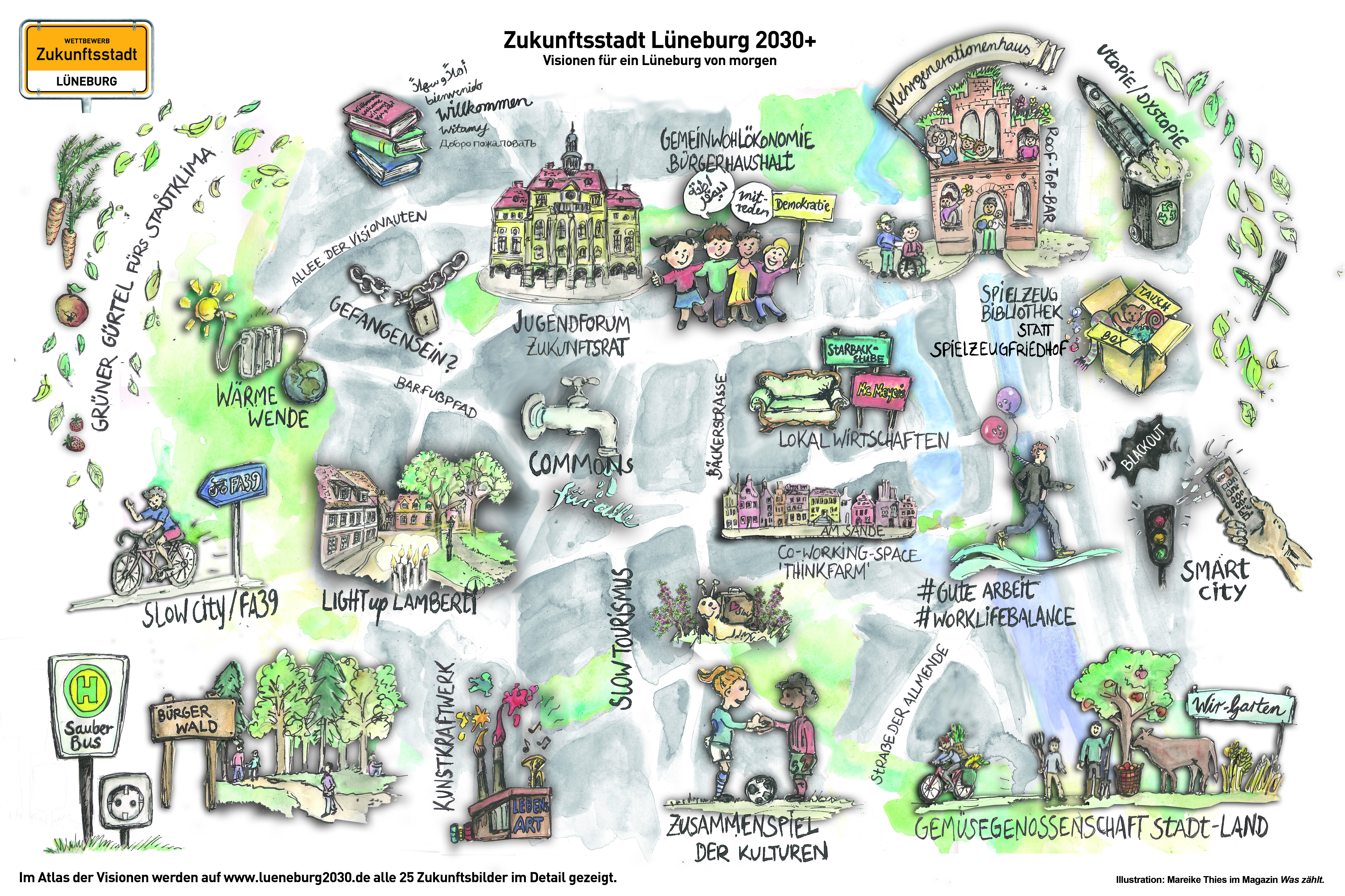 Deren Beiträge entwickelten sie zu Handlungsfeldern wie Arbeit, Stadtökologie, Jugend, Kultur, Einzelhandel, Mobilität oder Daseins- und Gesundheitsvorsorge. Die so entstandenen 25 Zukunftsvisionen haben die lokale Umsetzung der Sustainable Development Goals (SDGs) zum Ziel und ergeben den Atlas der Visionen für eine nachhaltige Hansestadt Lüneburg im Jahr 2030. Dieses tolle Ergebnis, den Atlas „Zukunftsstadt Lüneburg 2030+“, überreichten wir dem Oberbürgermeister im Mai 2016.